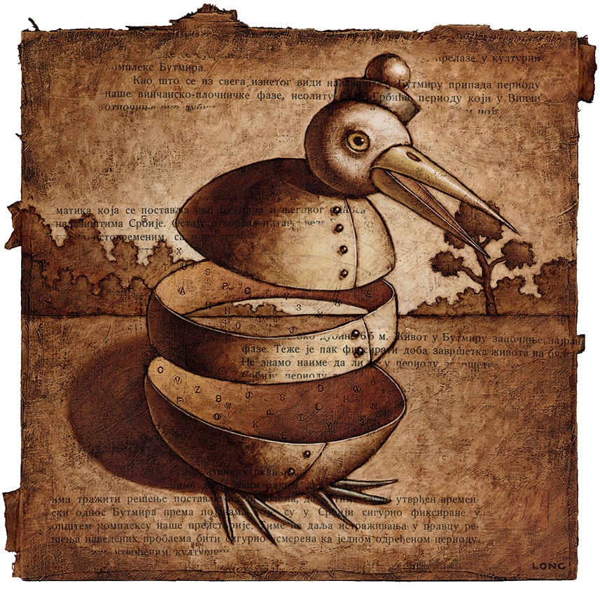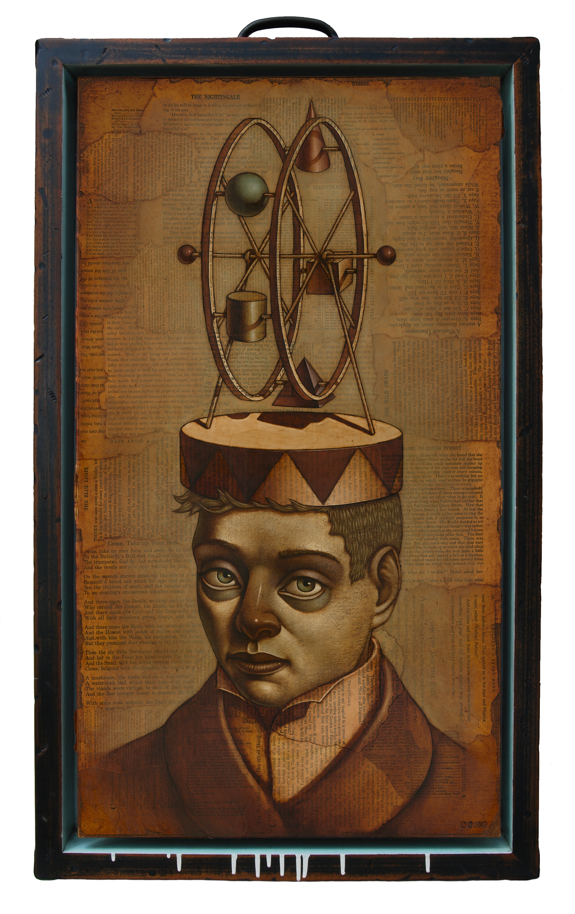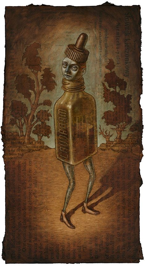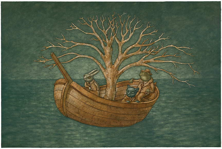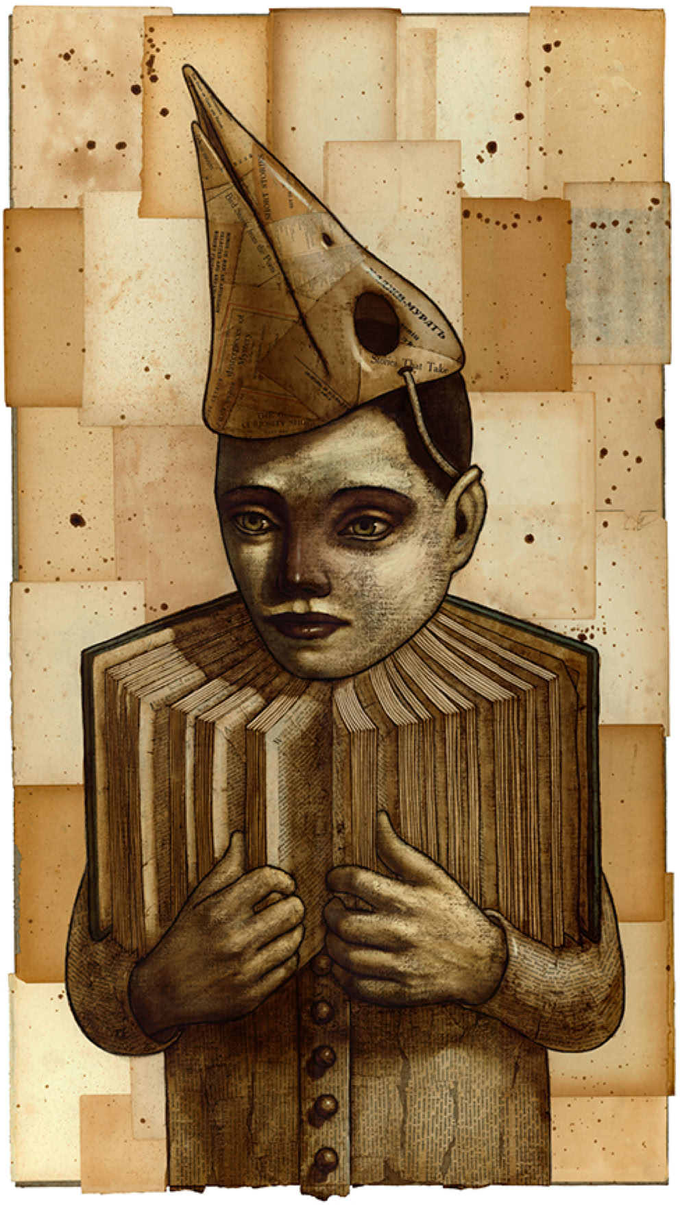 Oil paint over collaged text from found books.