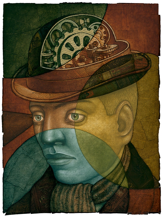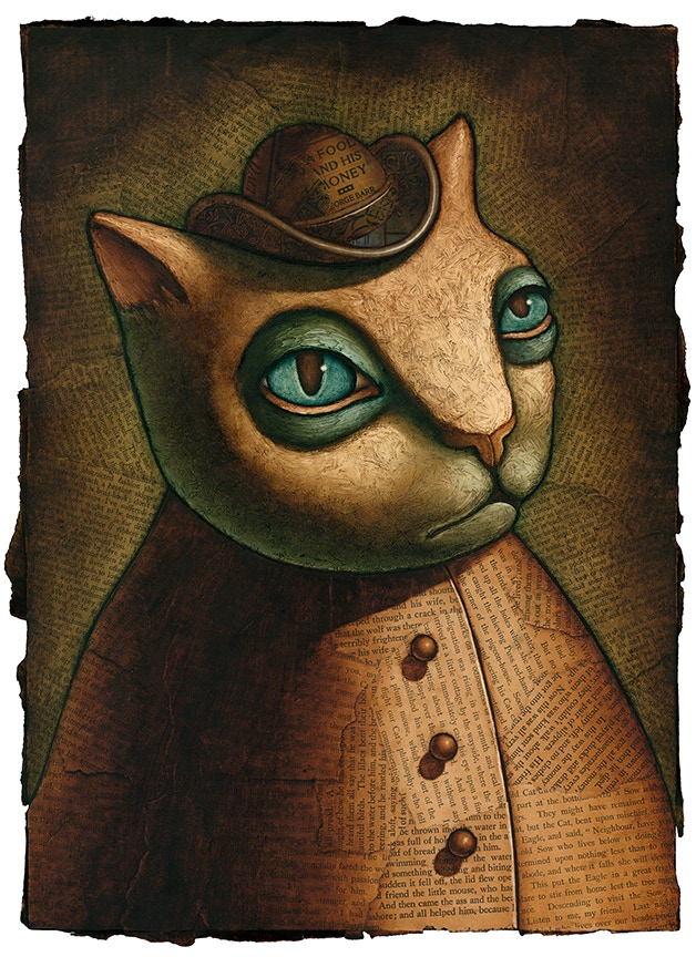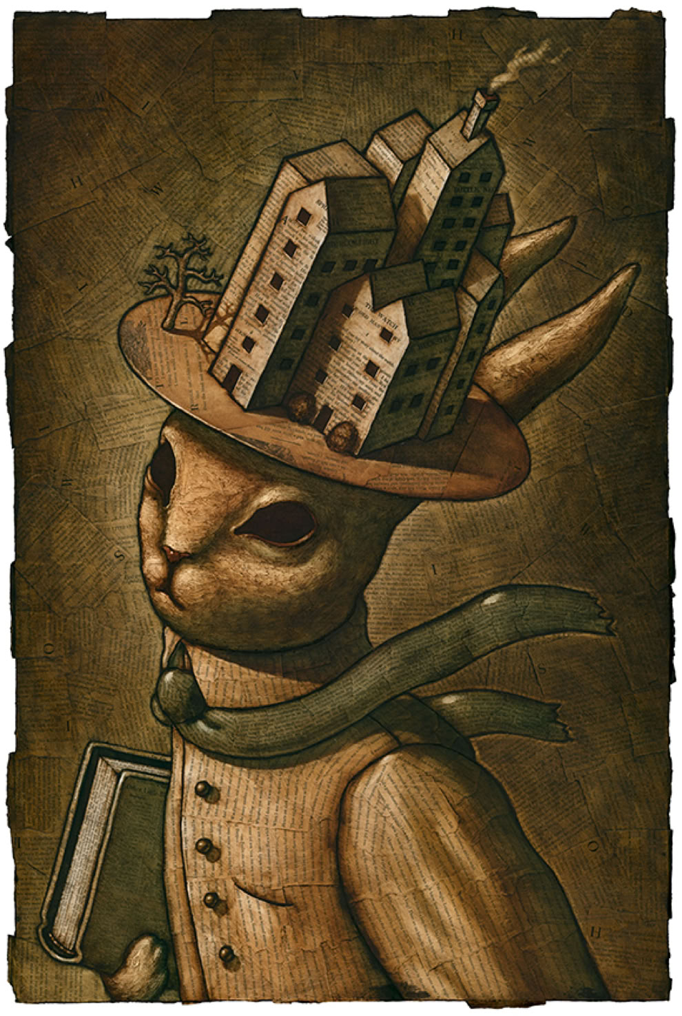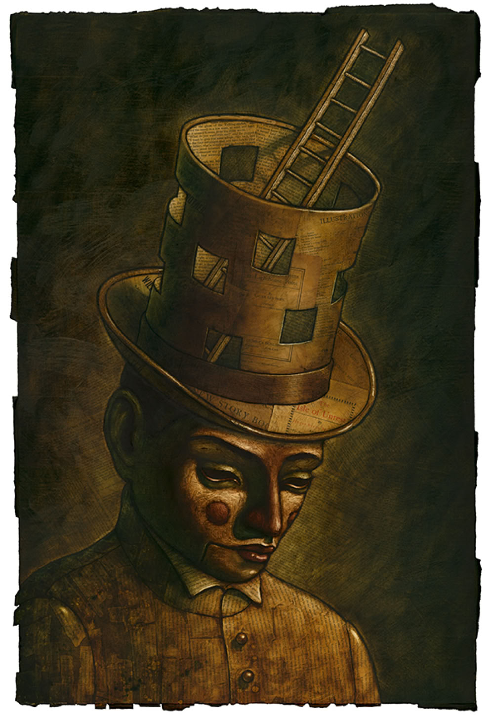 Oil paint over collaged text from found books.