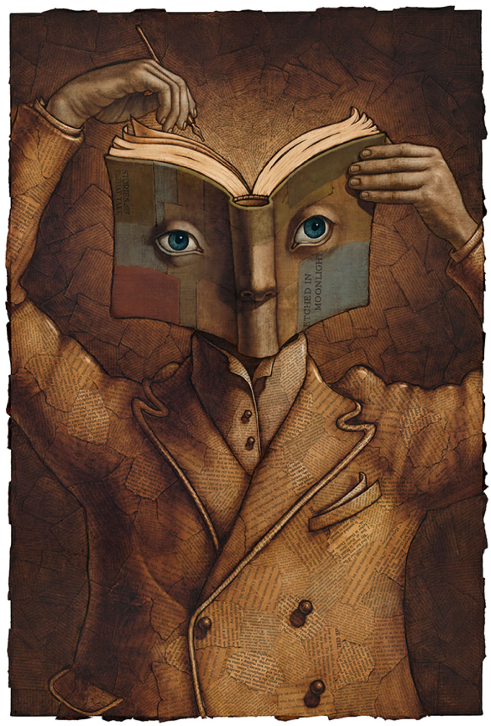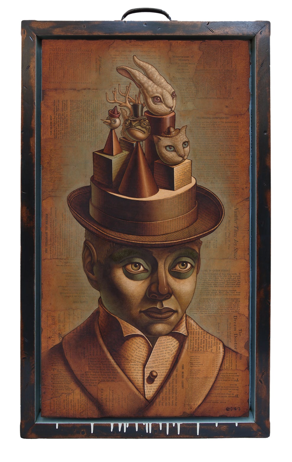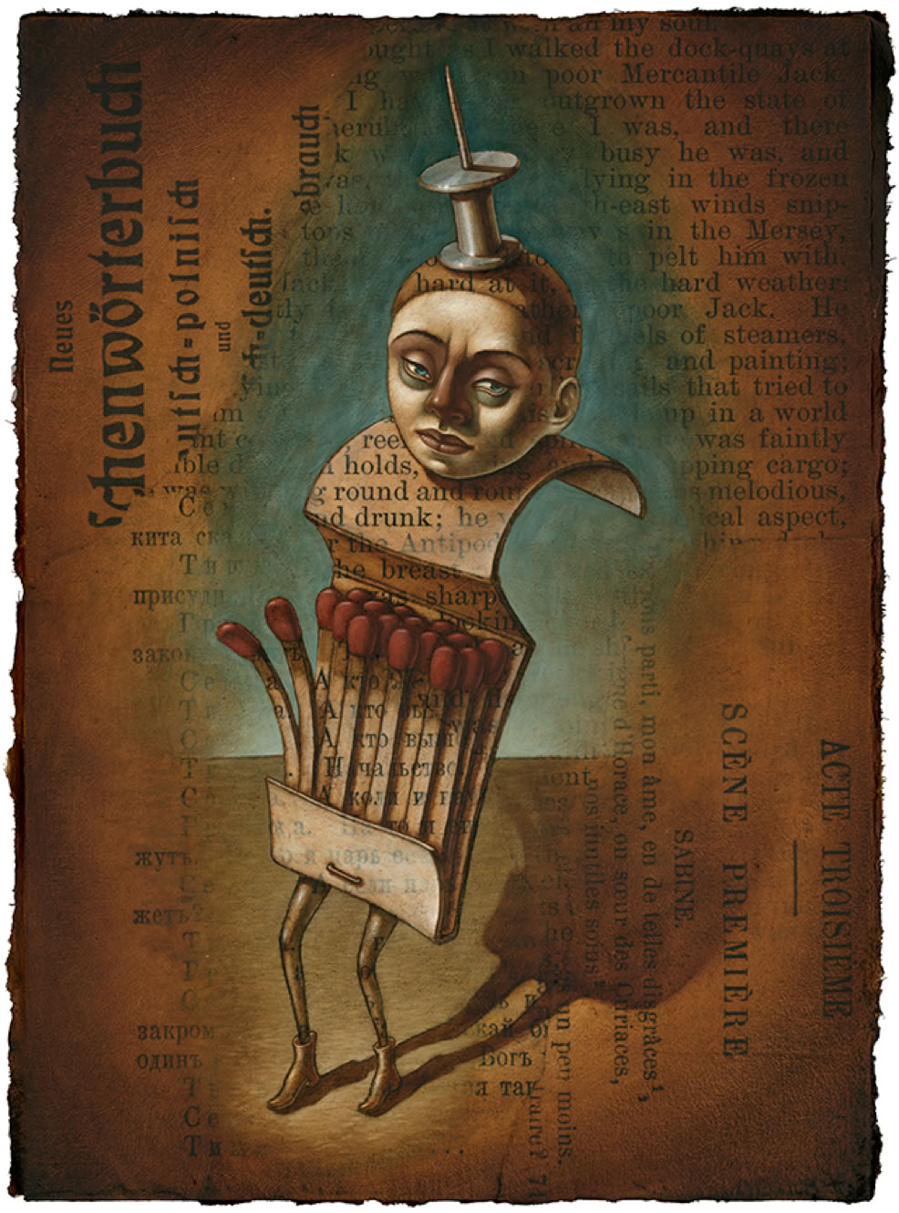 Oil paint over collaged text from found books.